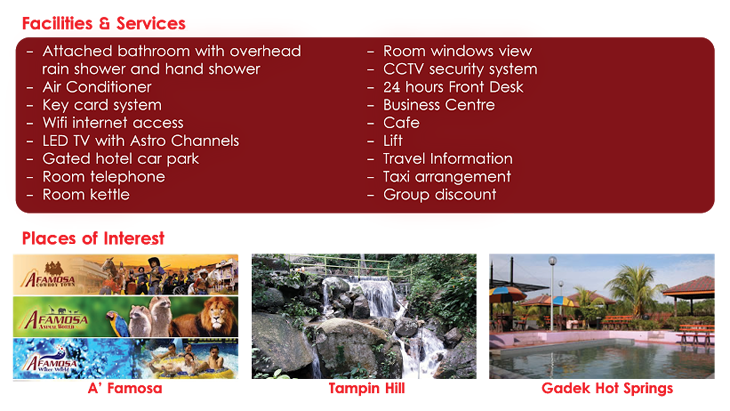 The 7-storey boutique hotel is located within the bustling town of Tampin, Negeri Sembilan close to places of interest such as A' Famosa Resort, Tampin Hill, Gunung Datuk and Gadek Hot Springs.